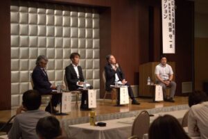 第2部では阿部知事に加え、壮青年部の重盛部長及び北城副部長、県青連の中村副会長にご登壇いただき、活発なトークセッションが行われました。重盛部長、中村副会長にはそれぞれの部、自分の会社のこれまでの取組、そしてこれからの展望についてお話しいただき、阿部知事からは社会課題に立ち向かうには行政だけでは限界があるため、若手経営者には県のパートナーとしてともに立ち向かってほしいとのメッセージをいただきました。