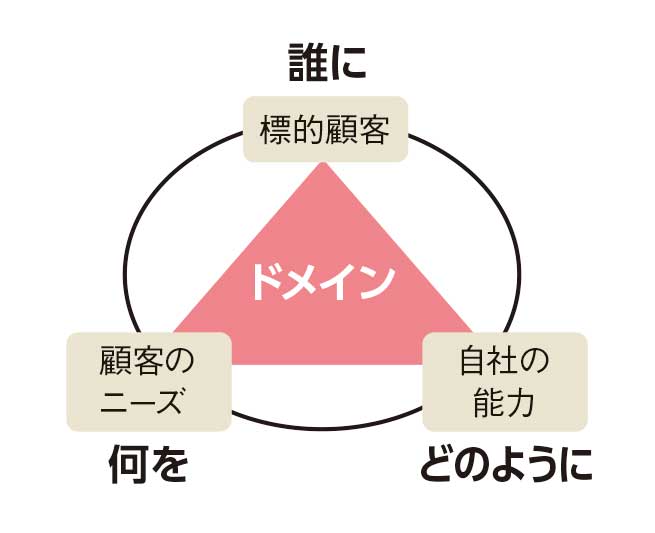 次に確認したいのが、自社のドメインです。ドメイン(事業領域)とは、自社の事業活動の範囲や領域のことで、「標的顧客(ターゲット顧客)」、「顧客ニーズ」=(お客様の求めている要求、困りごと)、「自社の能力」=(自社の製品、サービス、技術など)の3つから構成されます。