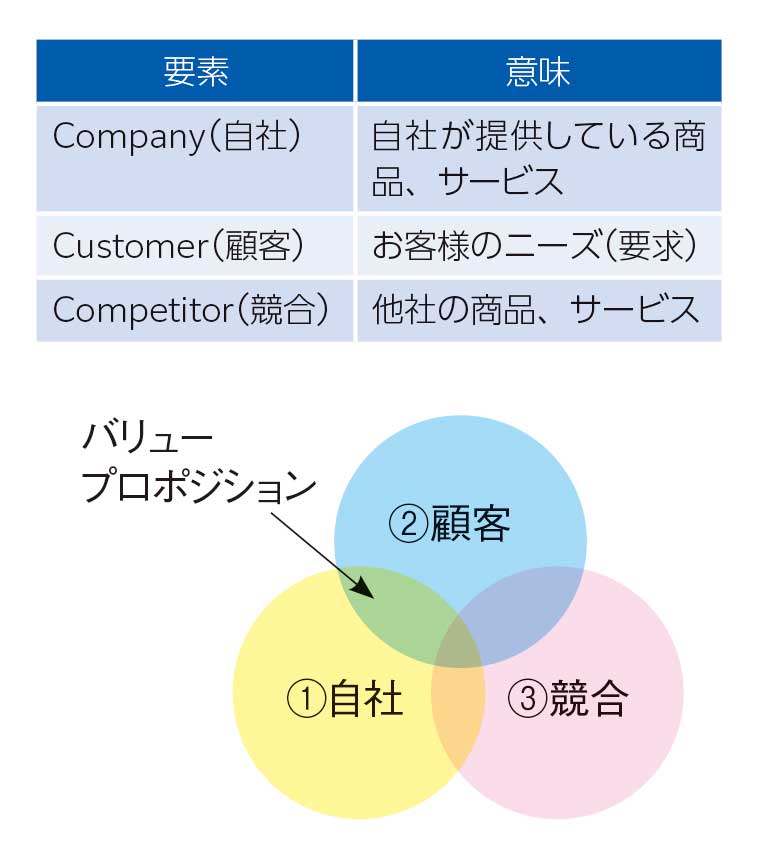 次に、外部環境を3C分析で整理してみます。これは、表の3つのC、Company(自社)、Customer(顧客)、競合(Competitor)の視点でビジネスの状況を確認し、自社だけが提供できる価値(バリュープロポジション)を明確にする分析です。