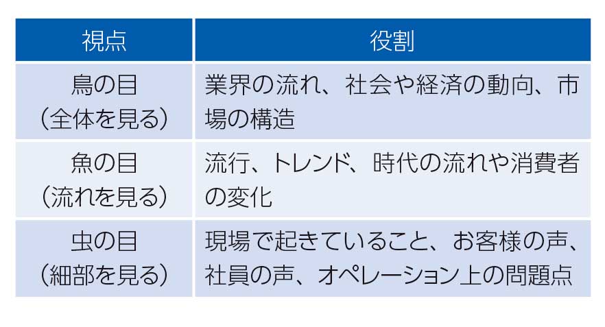 鳥の目、魚の目、虫の目という言葉があります。経営者の視点の在り方を示したものです。